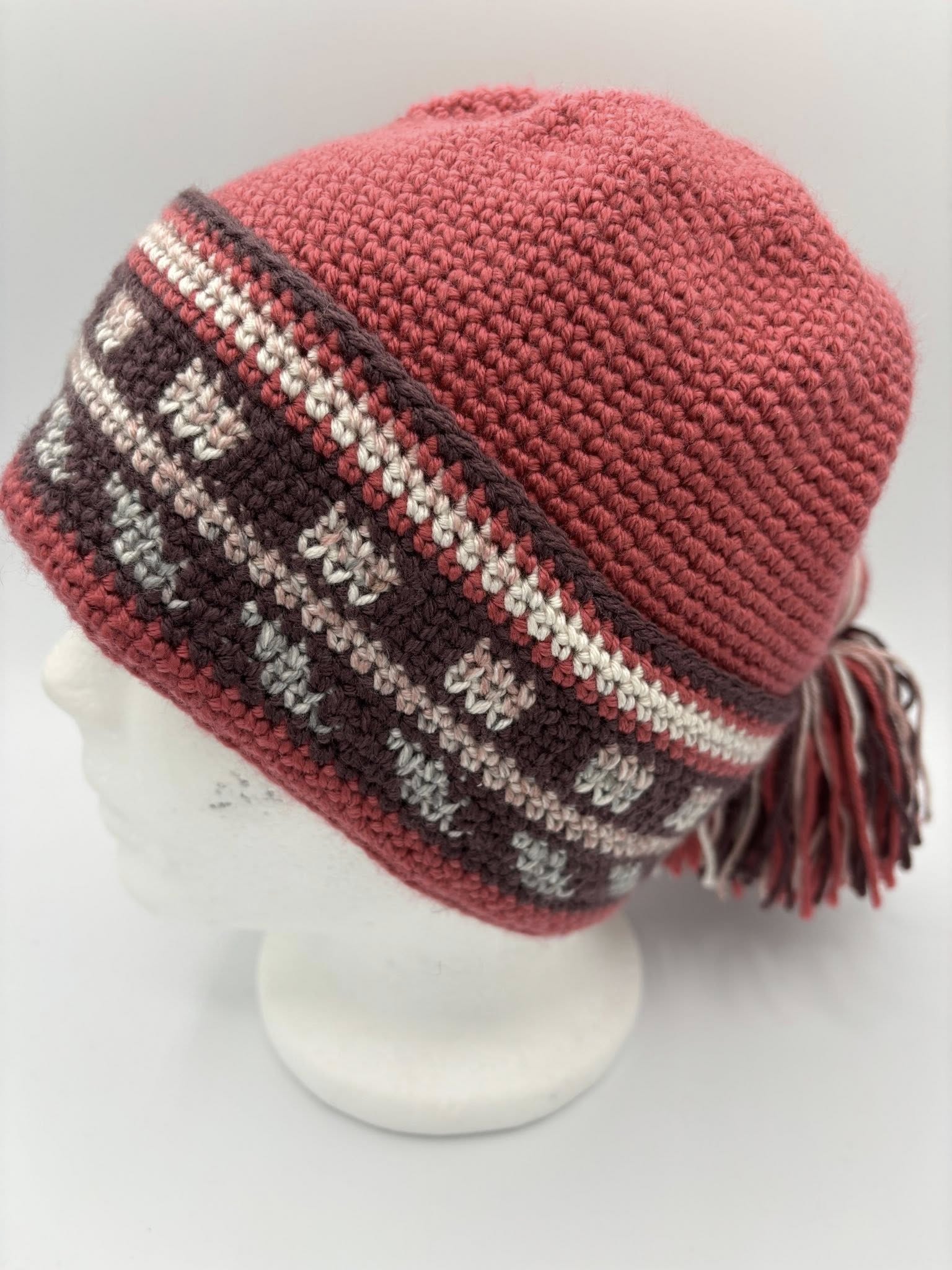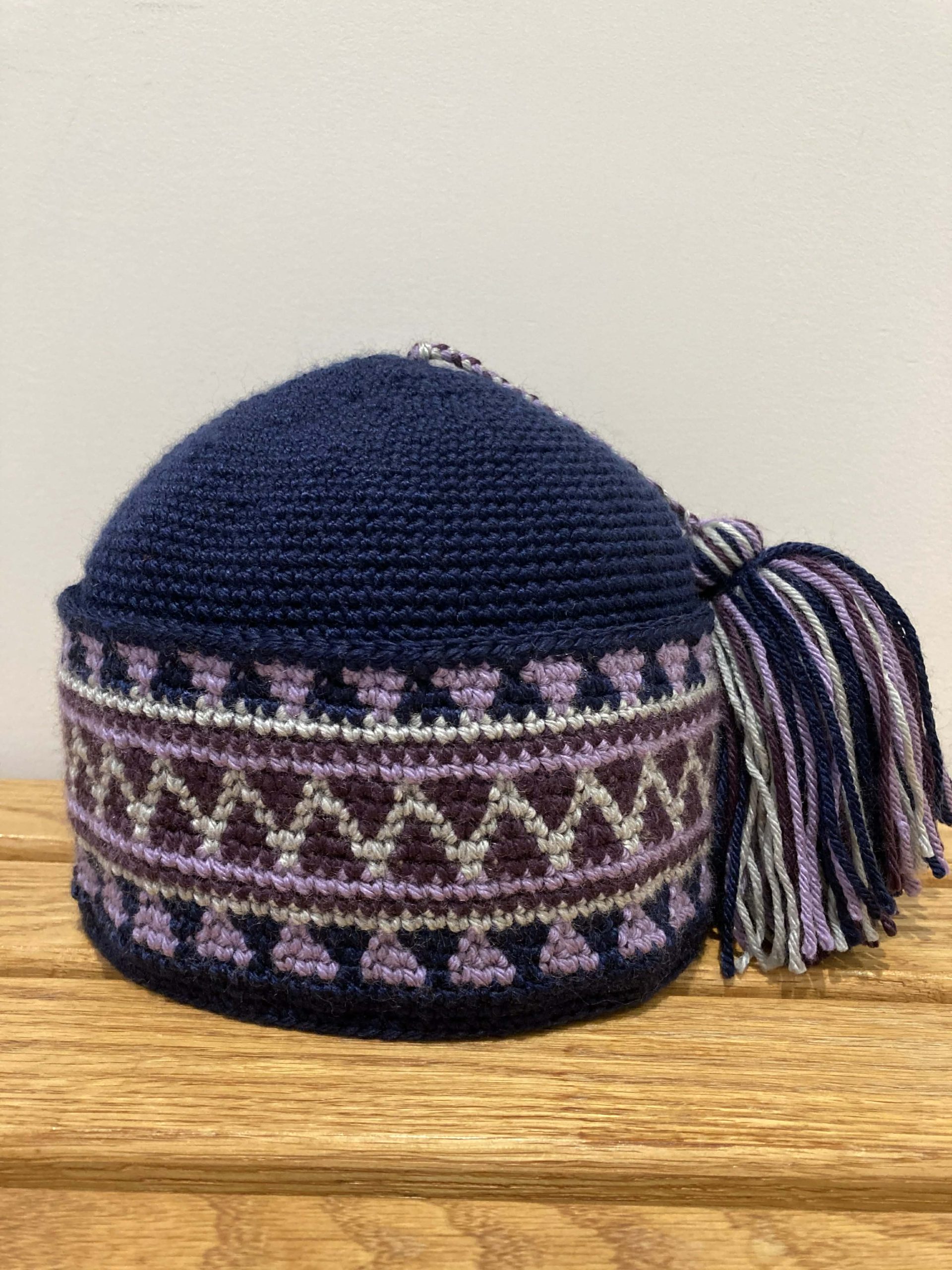 Nassak sans oreilles, base bleu marine, motif triangles et bâtonnets en lilas, violet et gris clair. Format 22.5 pouces.