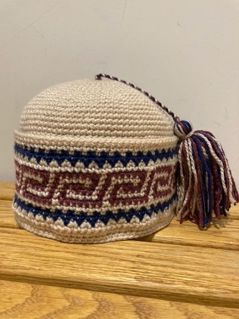 Nassak couleur prune rouge, garni en marine et crème, motif traditionnel inuit. Taille 22 pouces.