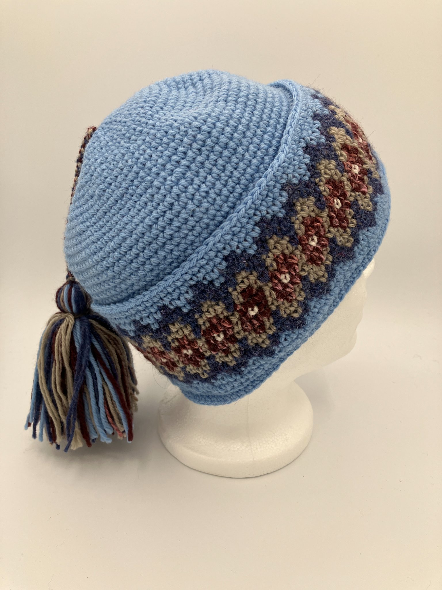 Nassak en 100% acrylique, 2 tons de turquoise garni de marine et blanc .