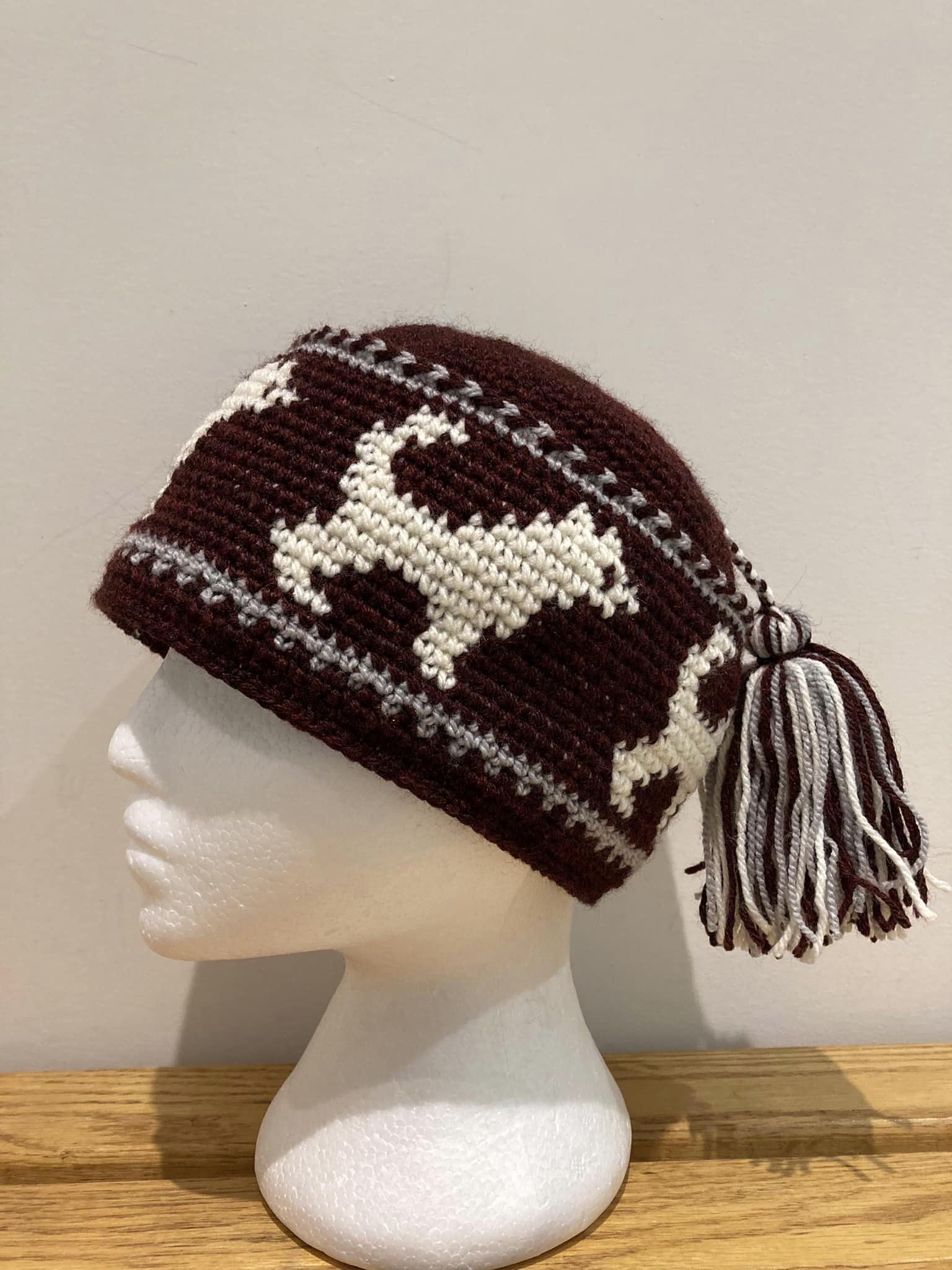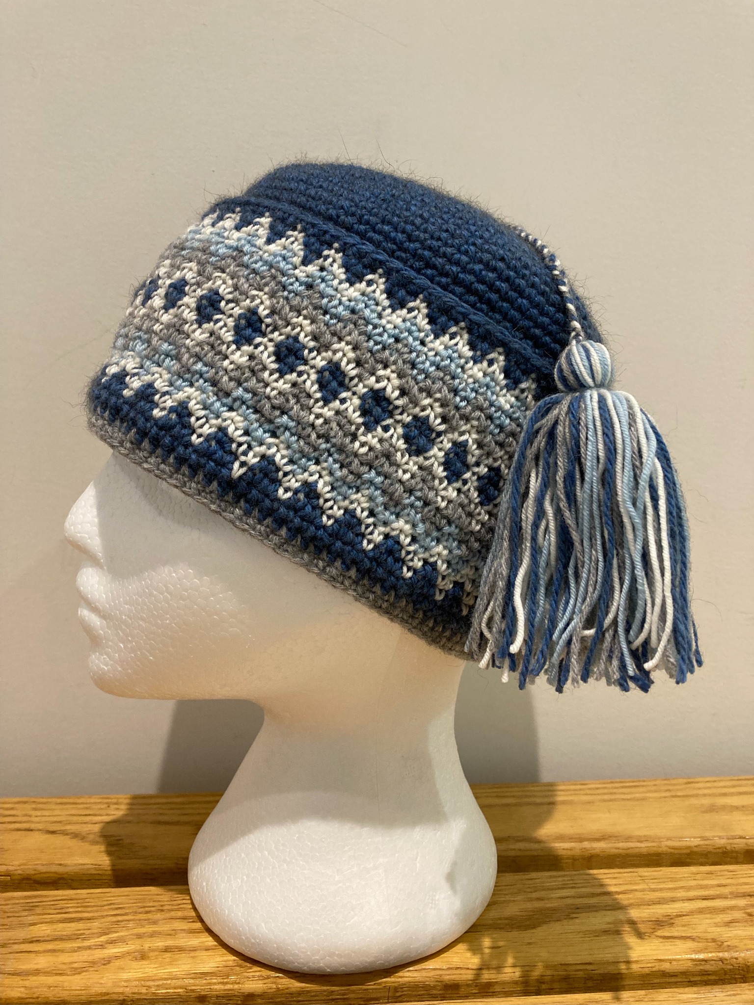 Nassak avec oreilles. Base gris pâle 65% acrylique, 35% laine. Motif traditionnel vaguelettes en rose foncé, blanc et noir.Taille 22 1/2 pouces.