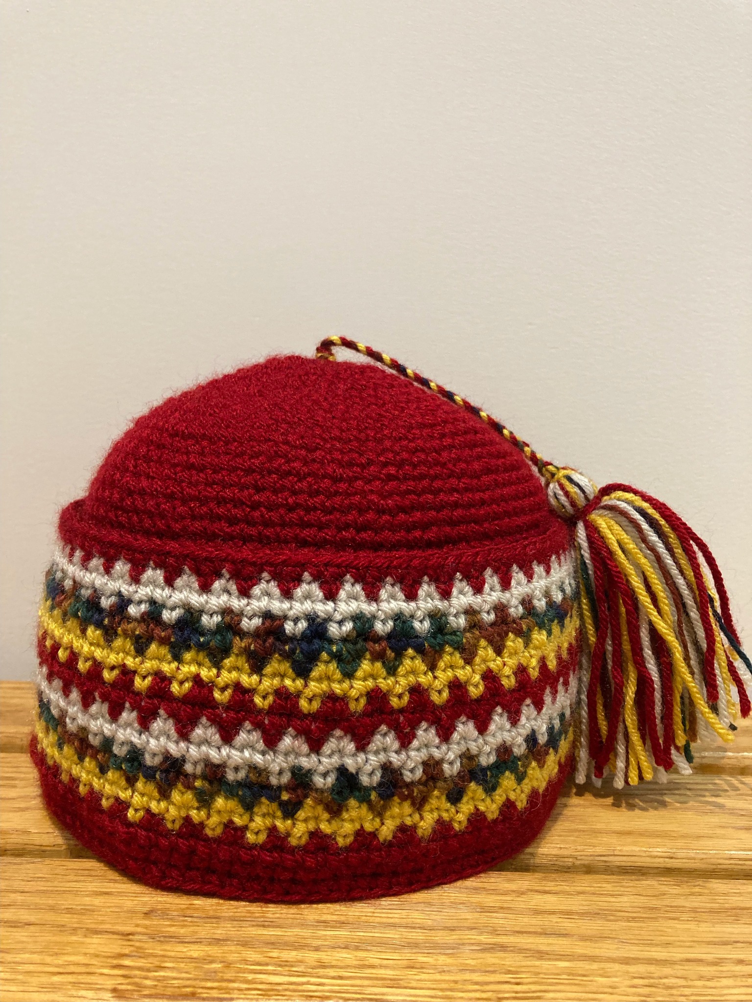 Nassak sans oreilles, base bleu pâle, couleurs complémentaires bleu roi, blanc, et tweedé turquoise et gris. Motif pointes dentelées et centres losanges. Taille 21 pouces. Par Céline Lefebvre